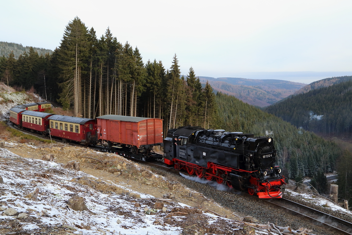 Nach zügiger Fahrt gibt es am Morgen des 25.02.2017 für 99 7232 mit ihrem IG HSB-Sonder-PmG nun den ersten Fotostopp und zwar an der schon traditionellen Stelle, oberhalb des Drängetales. Nach dem Aussteigen der Fotografen, wird jetzt zurückgesetzt, um dann mit Volldampf an der Knipsgemeinde vorbeizufahren.