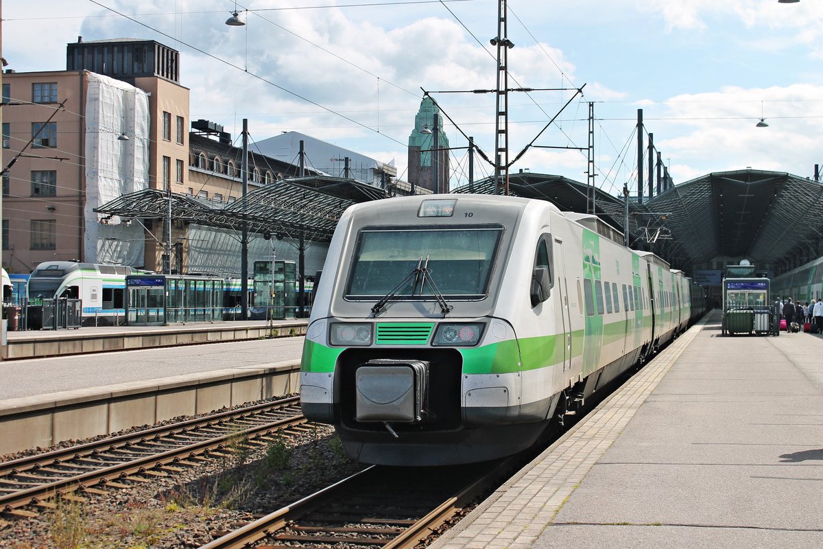 Nachschuss auf Sr2 3220, als diese am Mittag des 12.07.2019 ihre InterCIty-Garnitur an den Bahnsteig von Gleis 7 in den Hauptbahnhofv on Helsinki rangierte.