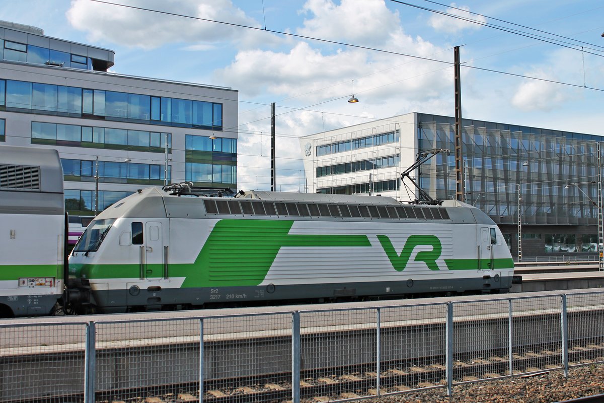 Portrait von Sr2 3217, als diese am Mittag des 12.07.2019 mit ihrem InterCity auf Gleis 12 im Hauptbahnhof von Helsinki stand.