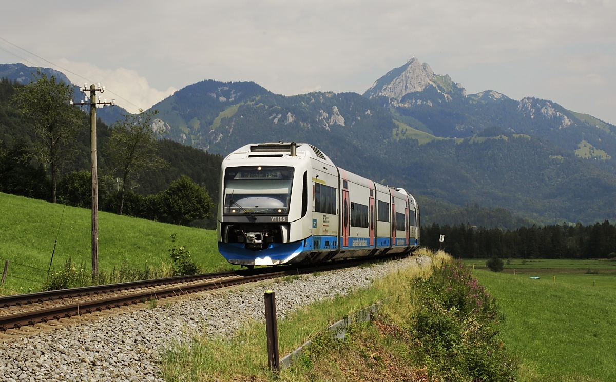 Die Telegrafenmasten und -leitungen vermitteln den Eindruck, als sei die Zeit an der KBS 955 stehengeblieben. Der planmäßige Einsatz von Dampflokomotiven im Oberland endetete allerdings schon im Mai 1967. Und auch die Integrale sind seit dem 26.07.2020 verschwunden, sie wurden durch LINT 54 ersetzt. Am 21.07.2020 konnte hier aber noch der VT 101 bei Neuhaus auf dem Weg nach Bayrischzell aufgenommen werden.