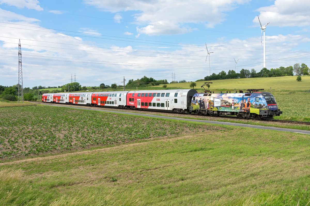 1116.231 "5Geht los" war am 21.05.2020 mit dem Railjet 73 von Wien nach Graz unterwegs. Die Aufnahme entstand bei Guntramsdorf.