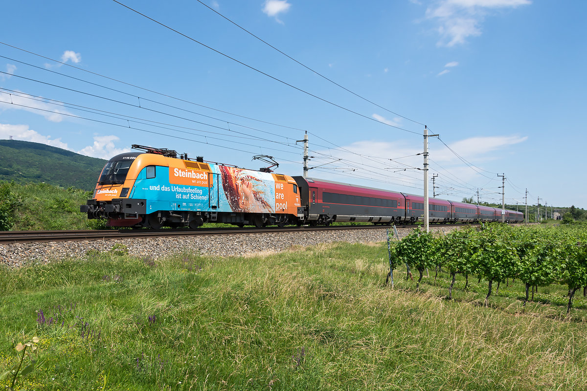 1116 229 "Steinbach-we are pool", unterwegs mit dem railjet 653 von Flughafen Wien nach Graz. Die Aufnahme entstand am 27.06.2020 zwischen Gumpoldskirchen und Pfaffsätten.