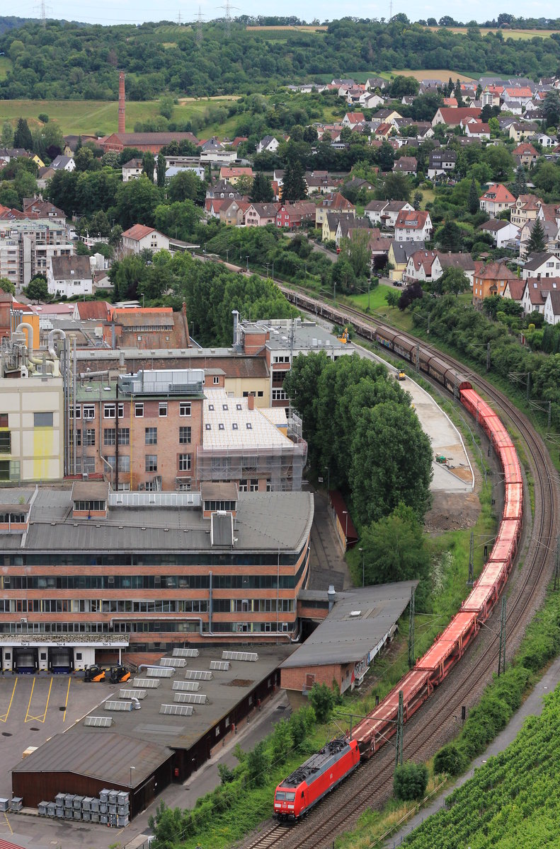 Am 24.06.2020 ist eine BR 187 mit einem gemischten Güterzug bei Lauffen am Neckar in Richtung Stuttgart unterwegs.