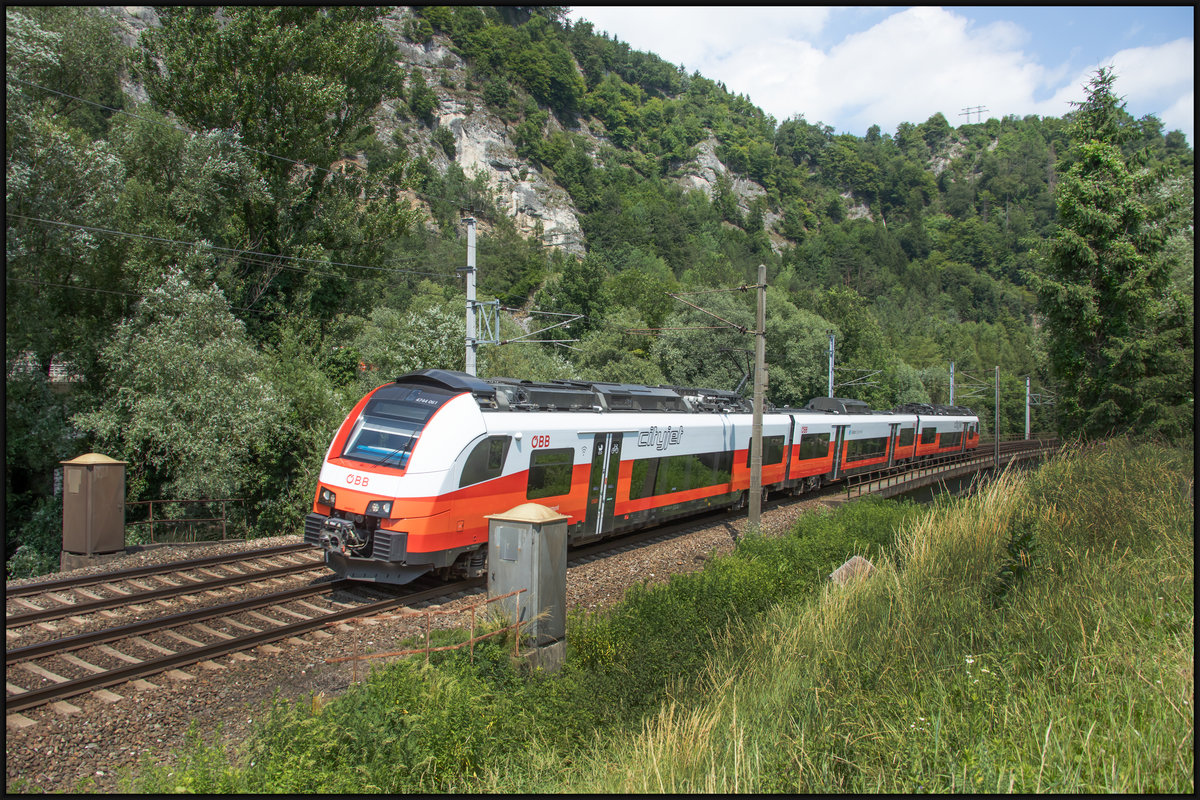 Teil des ausgedünnten Corona-Fahrplanes war am 24.04.2020 auch der Innsbrucker 4024 069-9. Als S 5120 der Linie S1 konnte er am Nachmittag dieses sommerlich warmen Frühlingstages an der markanten Felswand bei Wiesing auf der erneuten Fahrt von Kufstein nach Innsbruck Hbf dokumentiert werden.