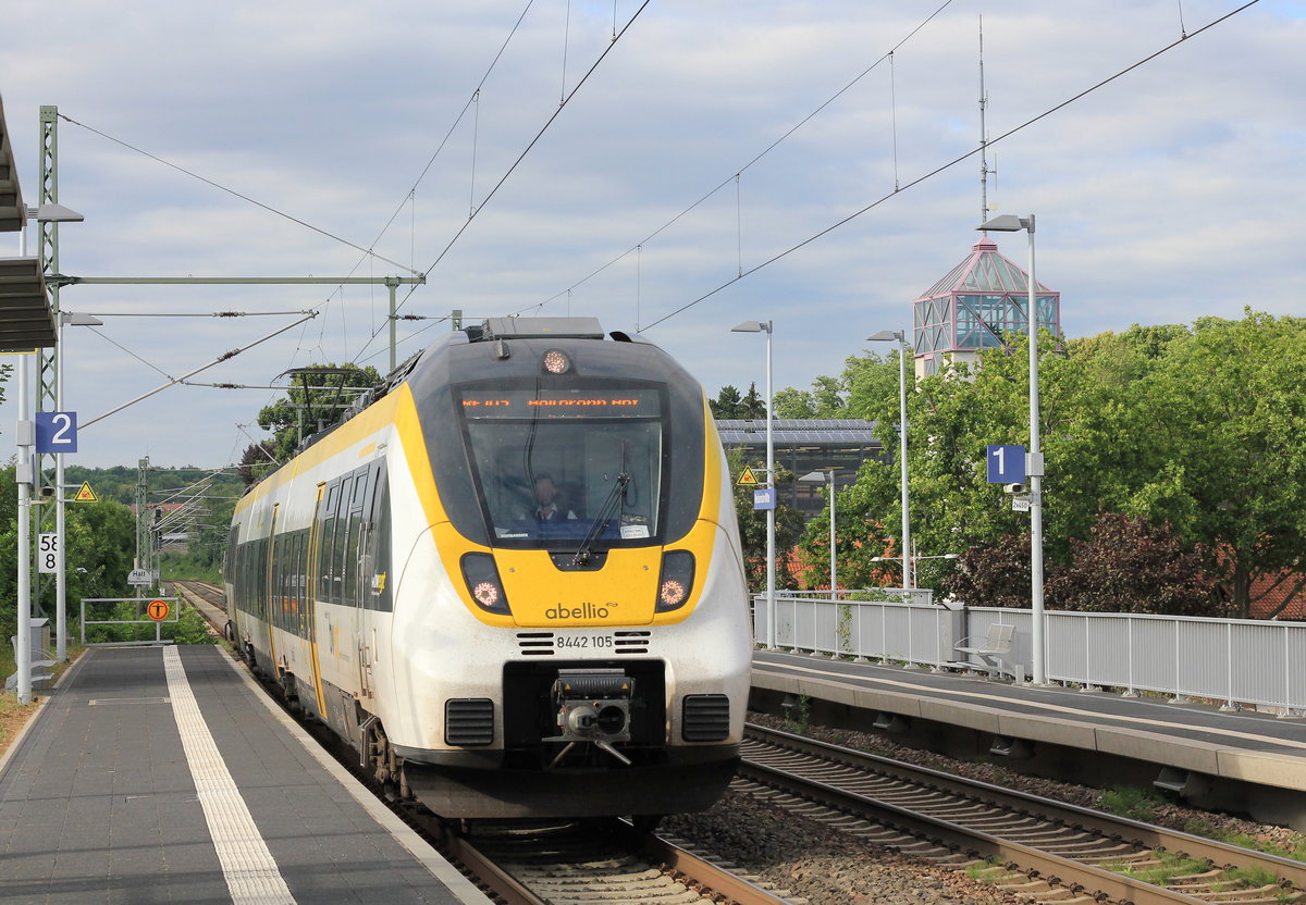 9442 604 (Bombardier Talent 2) der Abellio Rail Mitteldeutschland GmbH als RE 74732 (RE8) von Halle(Saale)Hbf nach Leinefelde fährt in Zscherben, Angersdorfer Straße, auf der Bahnstrecke Halle–Hann. Münden (KBS 590).