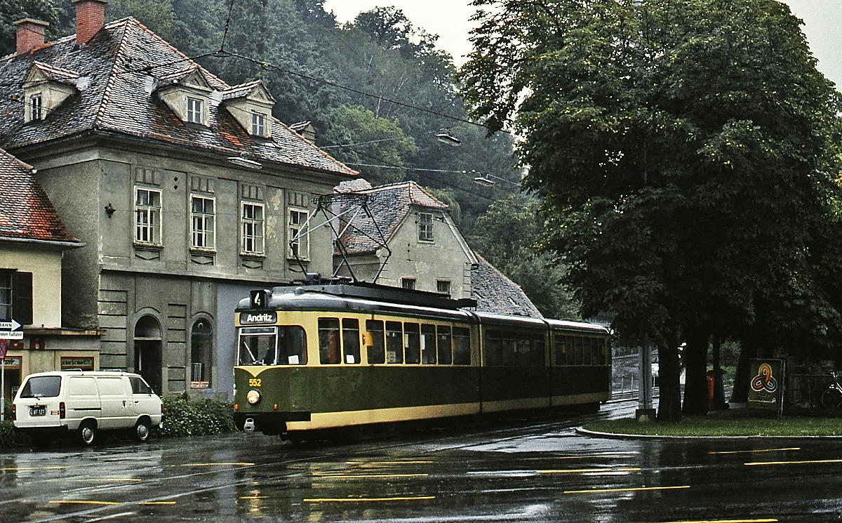 An einem völlig verregneten Augusttag 1986 fährt der ex-Wuppertaler Triebwagen 552 auf der GVB-Linie 4 unterhalb des Grazer Schloßberges in Richtung Andritz