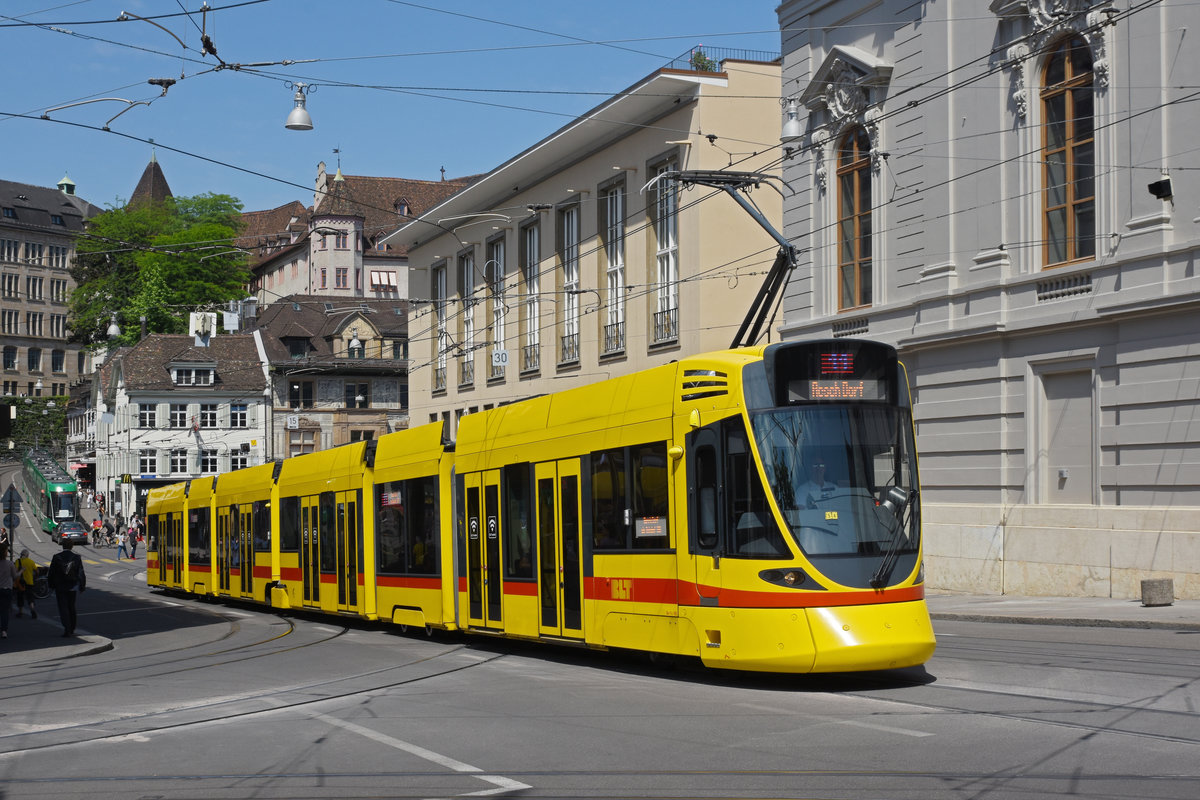 Be 4/6 Flexity 6002, auf der Linie 15, fährt den Steinenberg hoch zur Haltestelle Bankverein. Die Aufnahme stammt vom 28.05.2020.