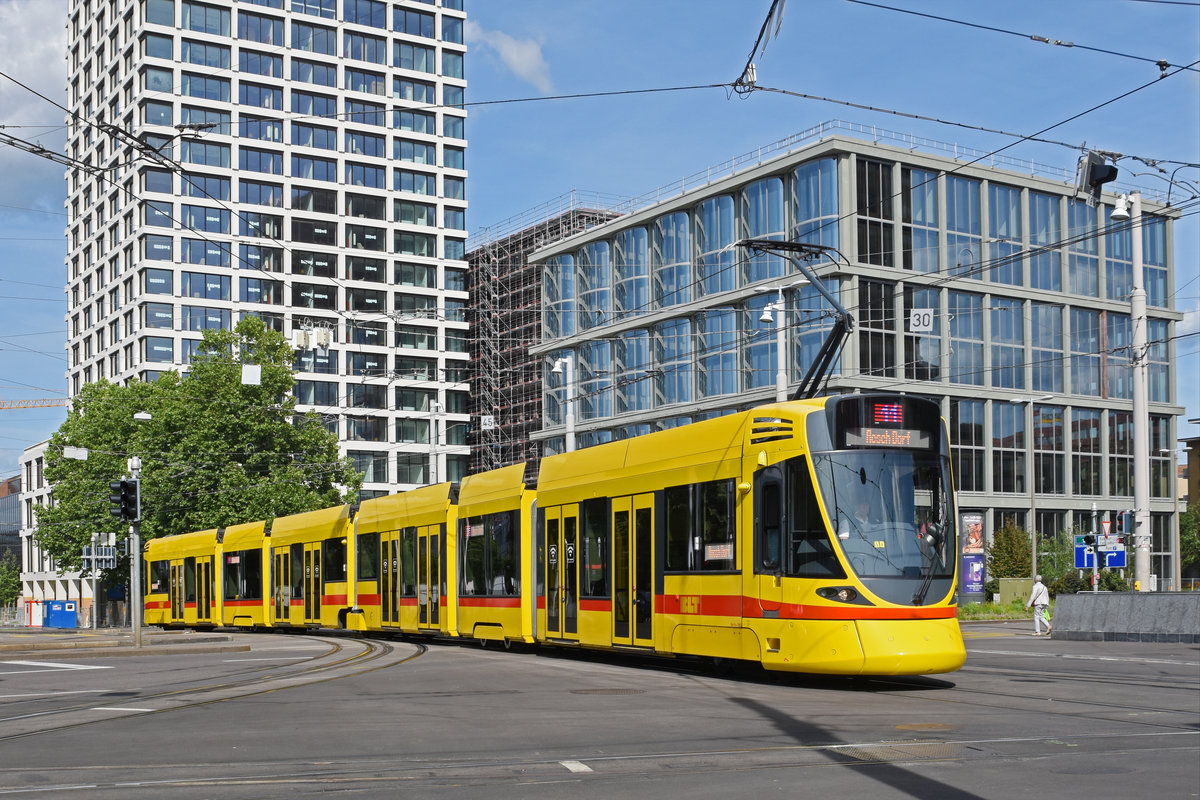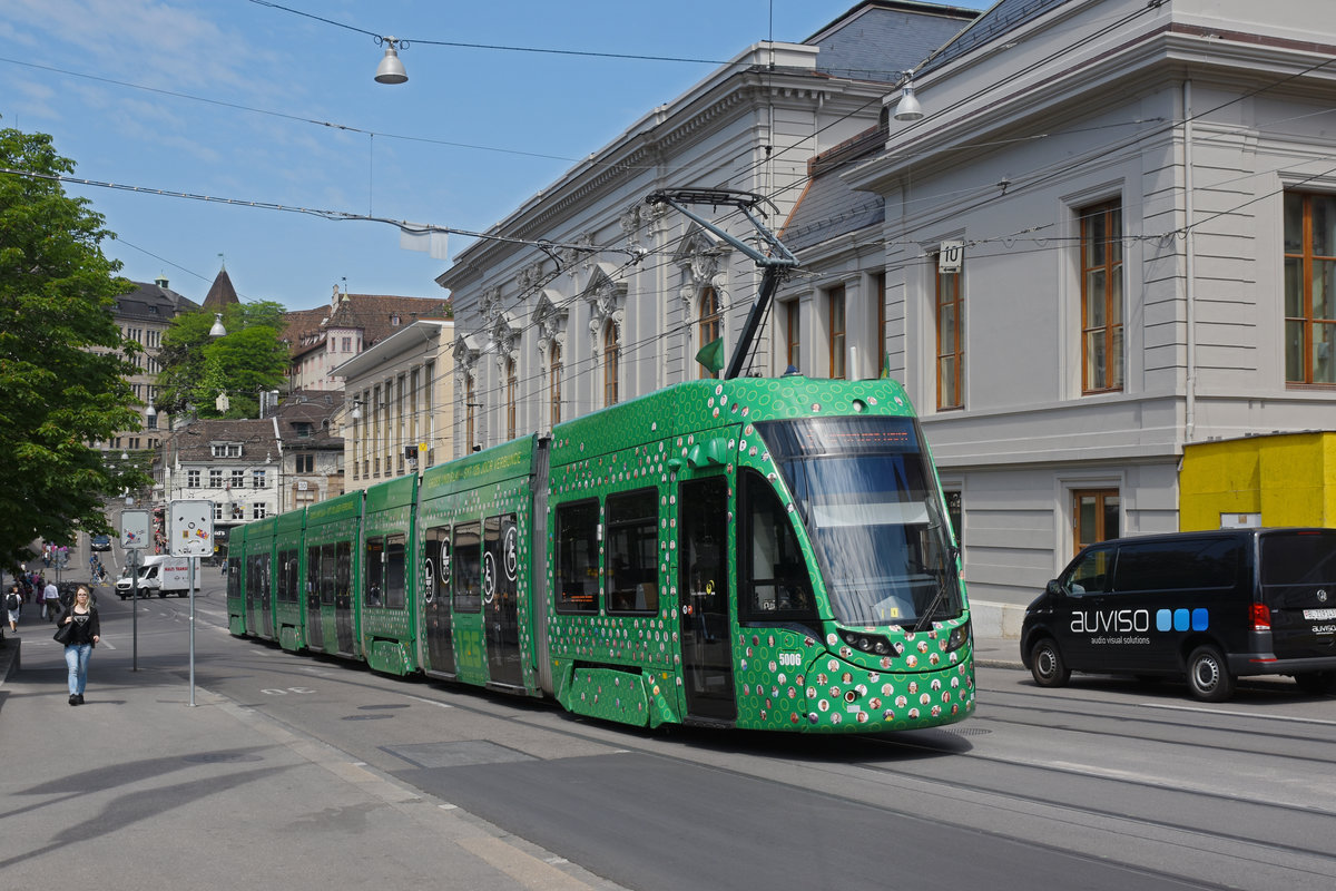 Die BVB feiert im Jahre 2020 das 125 Jährige Jubiläum. Aus diesem Grund fährt der Be 6/8 Flexity 5006 geschmückt mit keinen Bildern von Personen unter dem Motto "Gross und Glay syt 125 Johr verbunde" auf dem ganzen Netz. Aufnahme vom 28.05.2020 am Steinenberg.