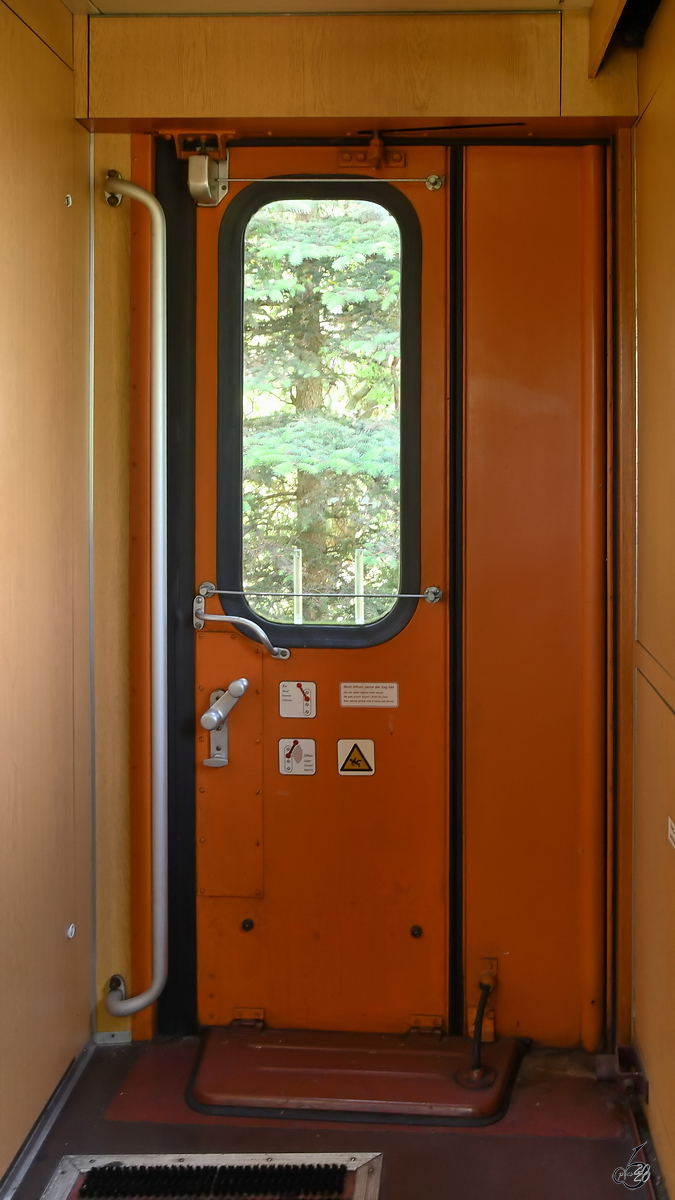 Die Einstiegstür eines Konferenzwagens des Gefechtszuges des Ministeriums für Nationale Verteidigung (MfNV). (Lokschuppen Pomerania, Pasewalk, Juni 2020)