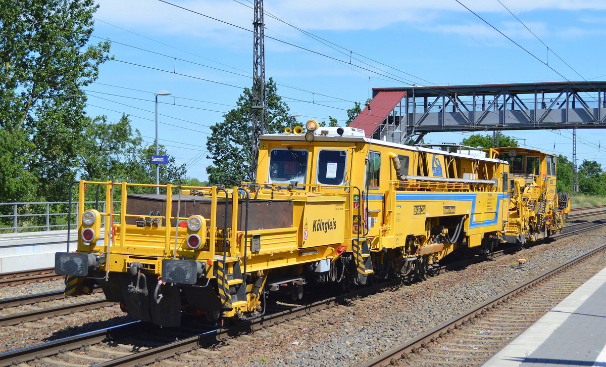 293 010-5 (Lok 8 | 710 964-8 | 110 964-4 | DR V 100.5) der DB Bahnbau Gruppe GmbH durchfährt mit zwei Flachwagen den Hp Magdeburg Herrenkrug auf der Bahnstrecke Berlin–Magdeburg (KBS 201) Richtung Magdeburg-Neustadt.