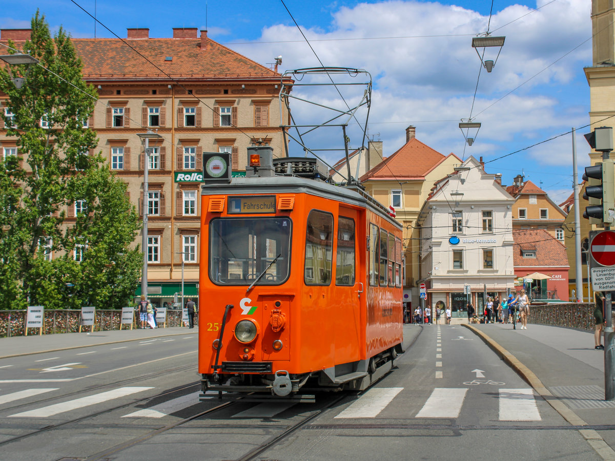 Graz. Nachschuss Um für die Saison 2020 im Tramway Museum Graz genug Personal zu haben, fand am 04.07.2020 eine Fahrschulfahrt mit Oldtimer 251 statt. Den ehemaligen Arbeitswagen konnte ich hier auf der Hauptbrücke ablichten.