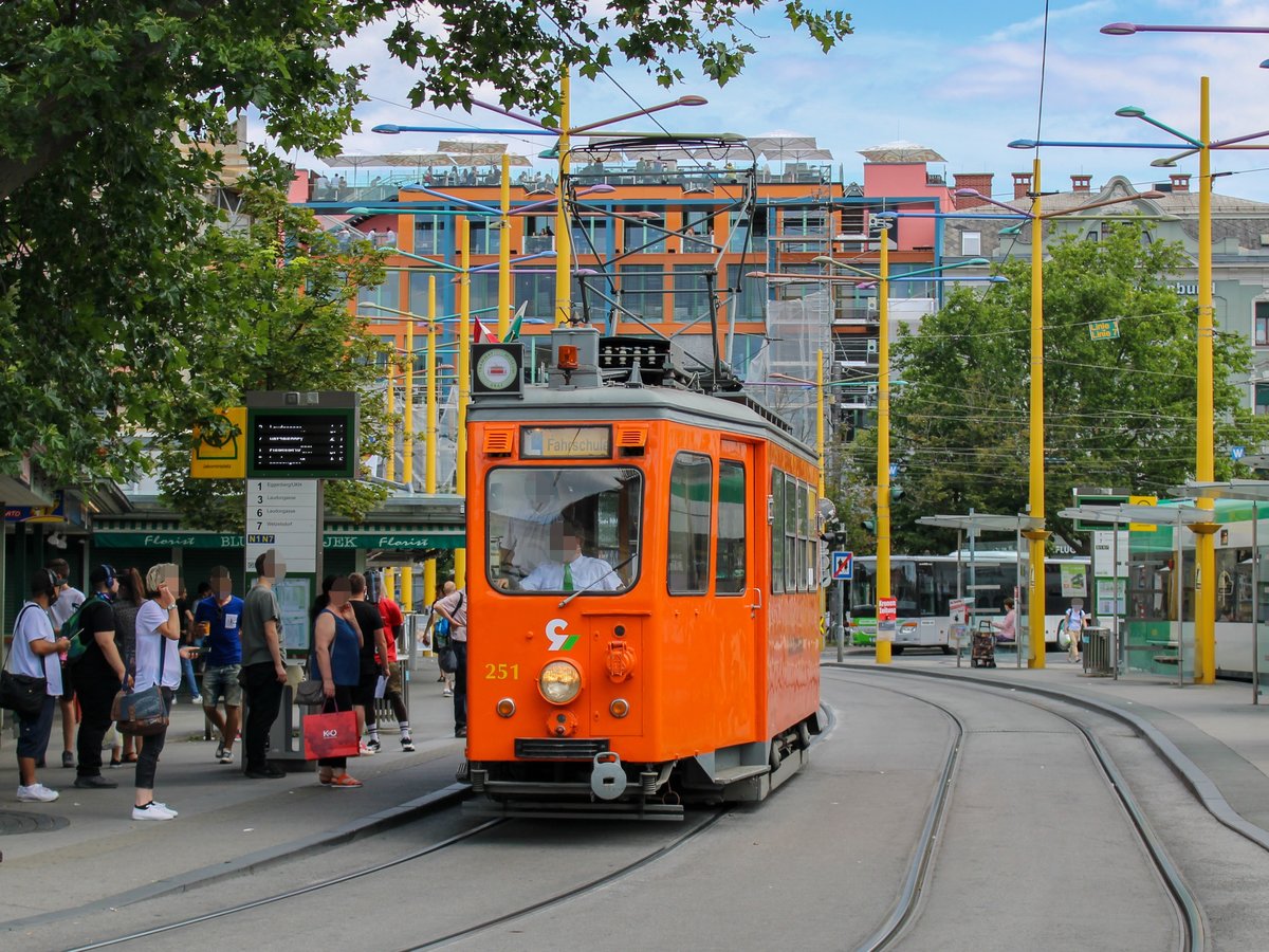 Graz. Um für die Saison 2020 im Tramway Museum Graz genug Personal zu haben, fand am 04.07.2020 eine Fahrschulfahrt mit Oldtimer 251 statt. Den ehemaligen Arbeitswagen konnte ich am Jakominiplatz ablichten.