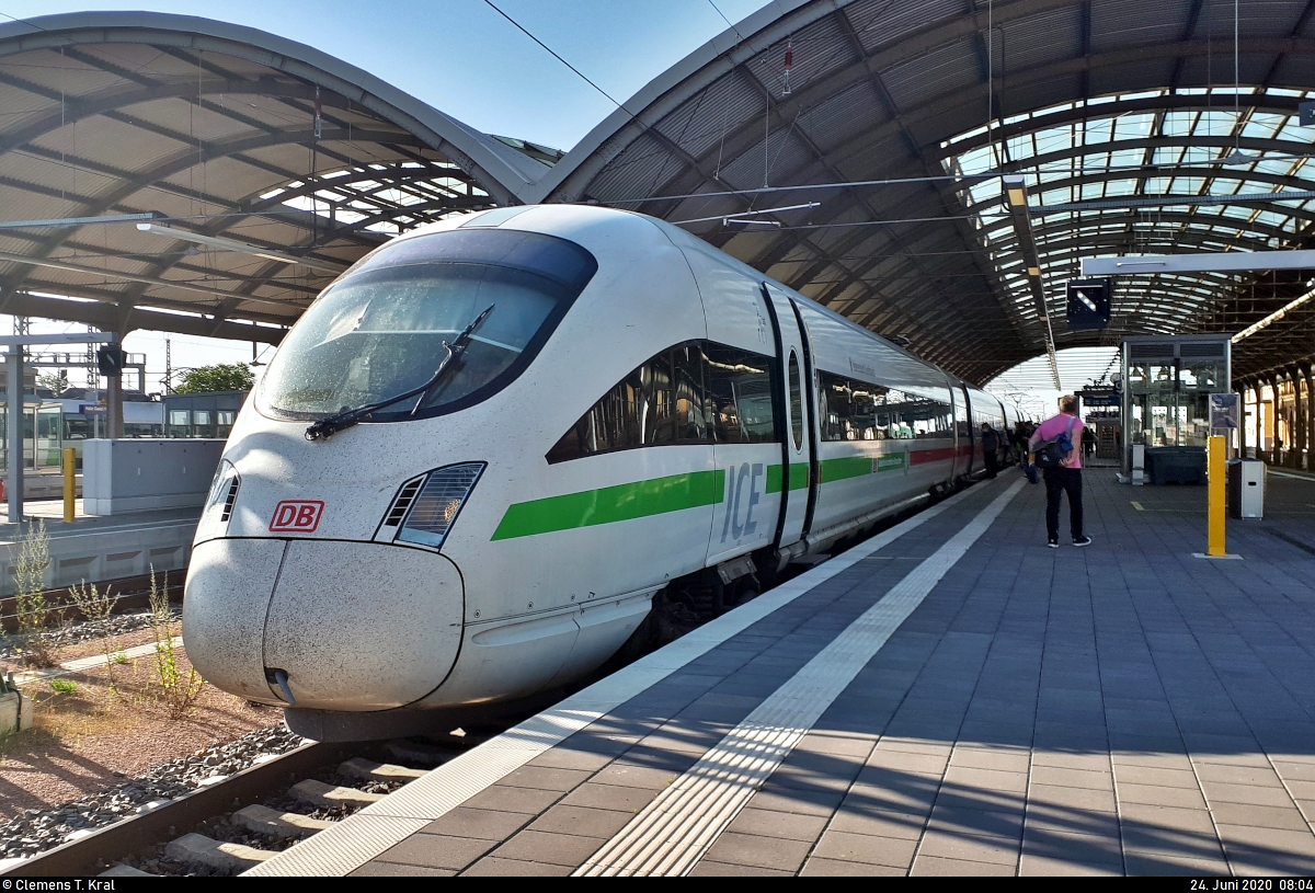 415 023-1 (Tz 1523 "Hansestadt Greifswald") als ICE 2900 von Leipzig Hbf nach Warnemünde, ersatzweise für IC 2238 "Warnow" (Linie 56), steht in Halle(Saale)Hbf auf Gleis 9.