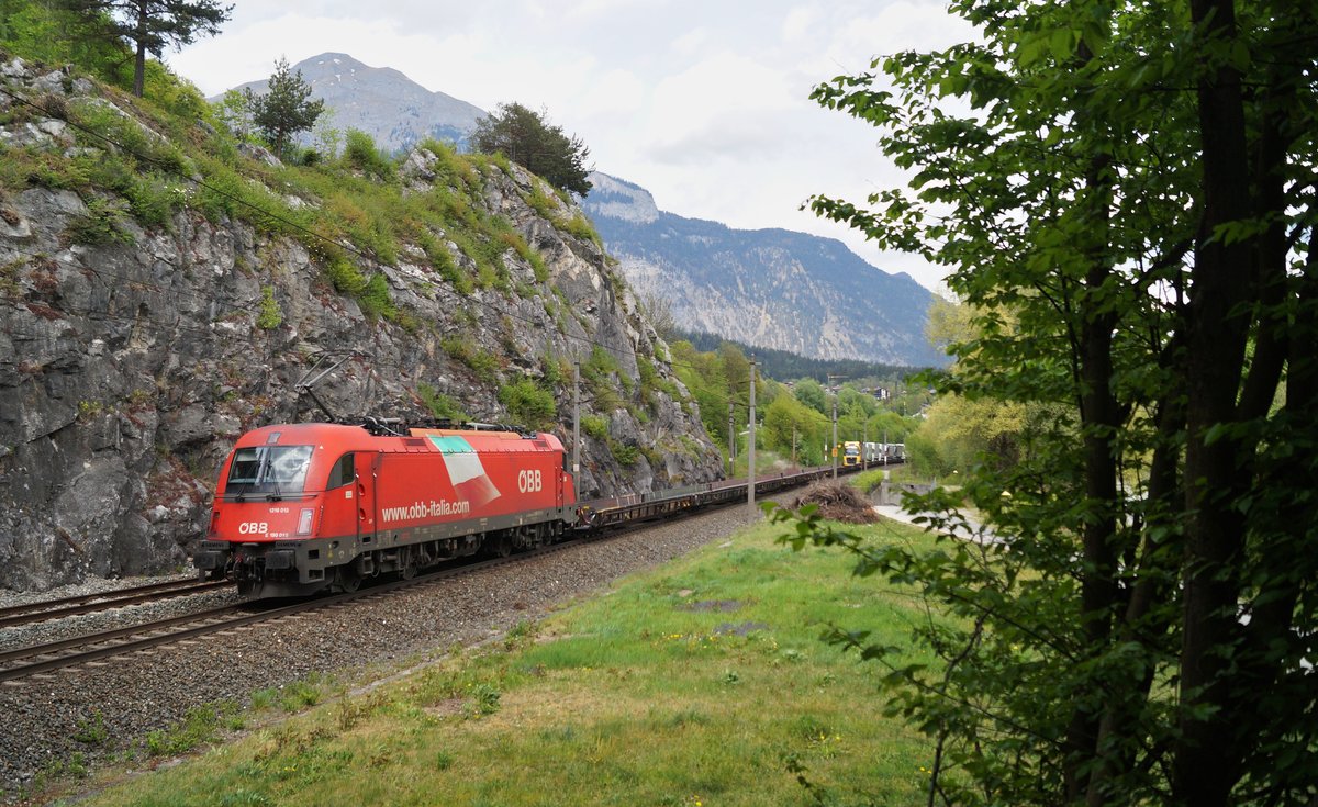 Infolge der coronabedingt gestrichenen EC-Verbindungen München – Italien kamen die ÖBB-Maschinen der Reihe 1216.0 bei anderen Leistungen zum Einsatz. So war die "Flaggenlok" 1216 015-8 am 24. April 2020 mit einer RoLa auf dem Weg vom Brenner nach Wörgl Terminal West. Bei Jenbach entstand die Aufnahme des coronabedingt recht schwach ausgelasteten Zuges.
