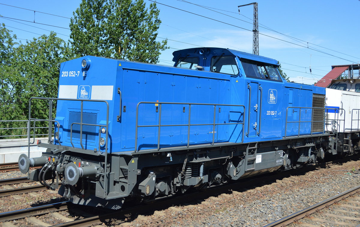 PRESS - Eisenbahn-Bau- und Betriebsgesellschaft Pressnitztalbahn mbH, Jöhstadt mit "203 052-7" [NVR-Nummer: 92 80 1203 165-6 D-PRESS] hinter der Press "203 051-8" am Ende eines Güterzuges für Holzhack-Schnitzel gezogen von SETG "193 814" am 23.06.20 Bf. Saarmund.