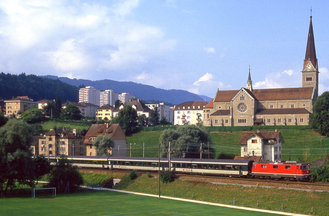 Re 460 016 "Rohrdorferberg - Reusstal" am 4.6.20 mit dem IC 8 nach Brig bei der Durchfahrt in Mülenen.