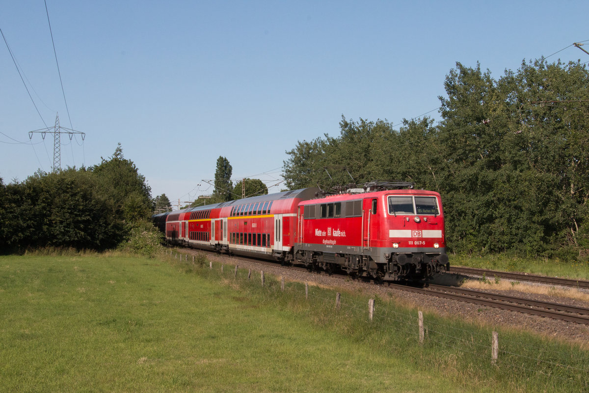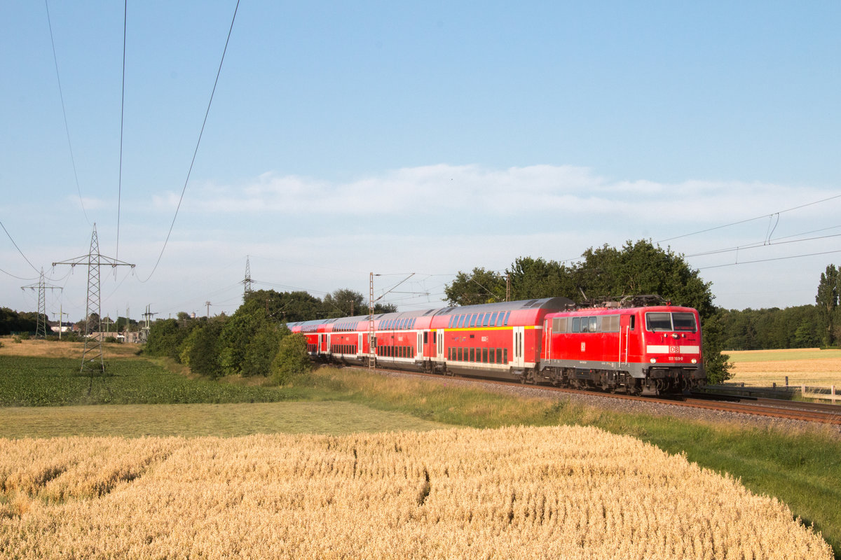 111 067 der Deutschen Bahn AG war am 24. Juni 2020 mit dem Regionalexpress 10454 von Düsseldorf Hauptbahnhof nach Aachen Hauptbahnhof unterwegs, hier hinter dem Haltepunkt Herrath.