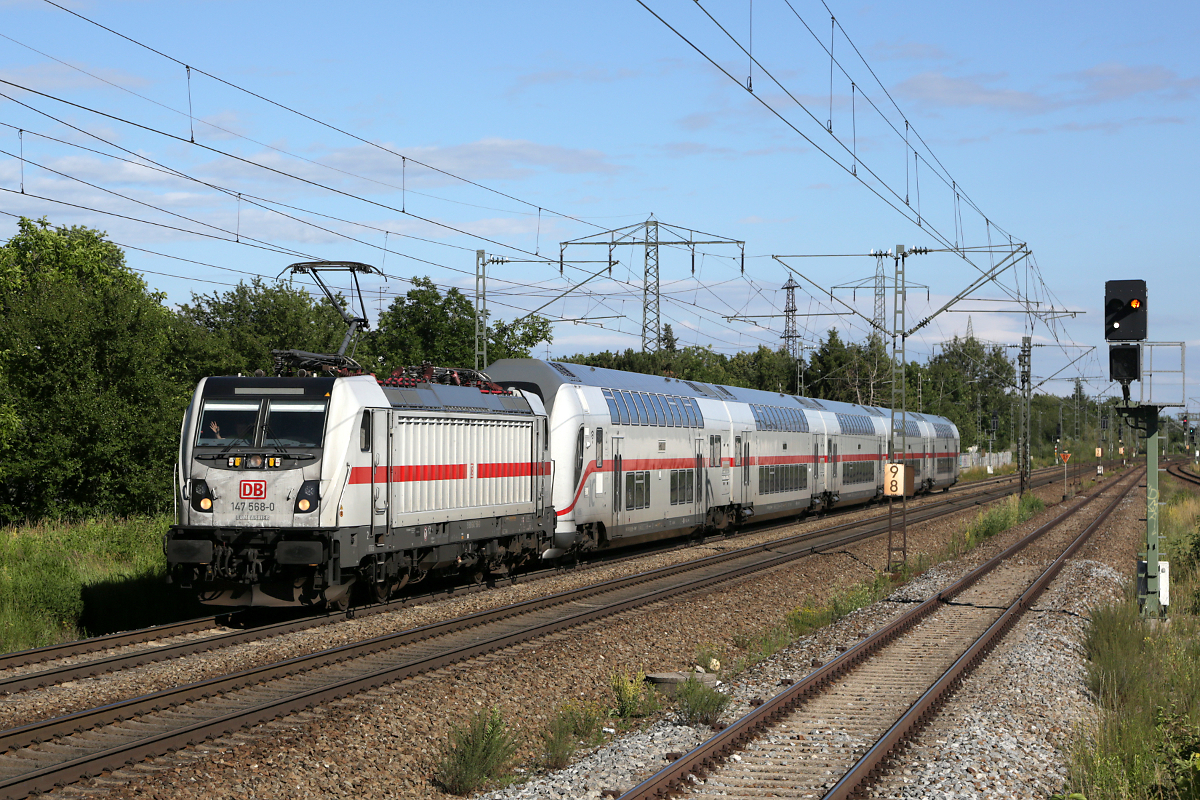 147 568 mit einer IC2-Leergarnitur am 30.06.2020 bei München-Langwied