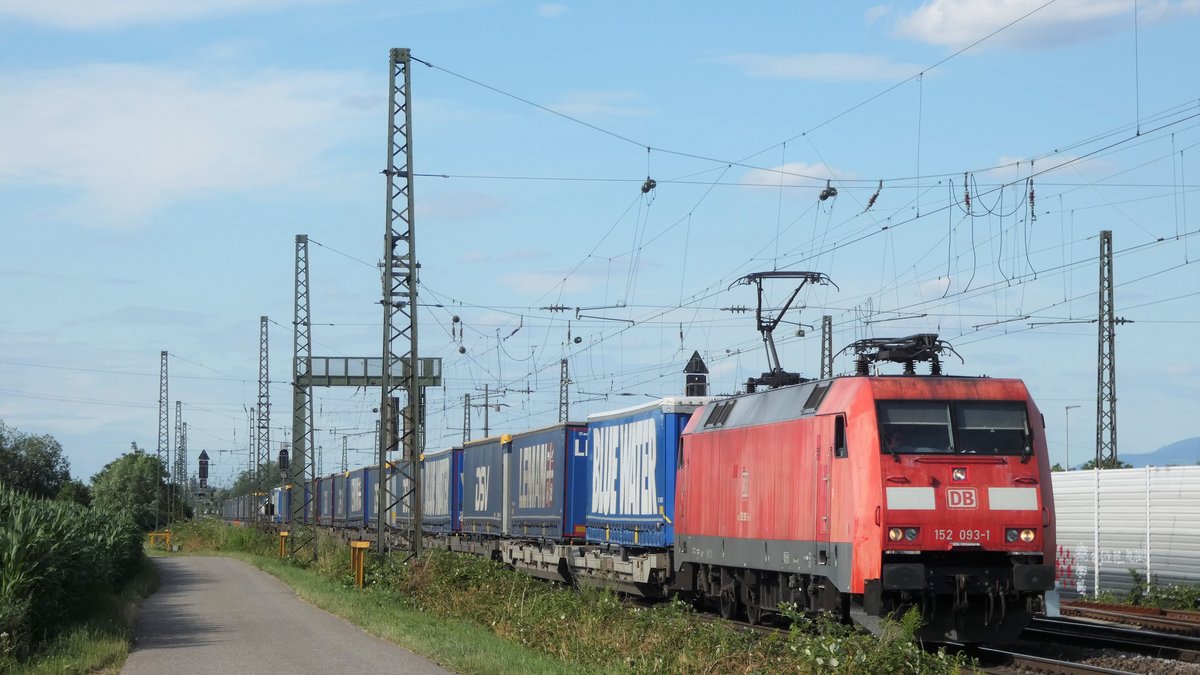 152 093 fährt am 04.07.2020 mit dem KT40009 (Taulov - Gallarate) durch Niederschopfheim gen Schweiz.
