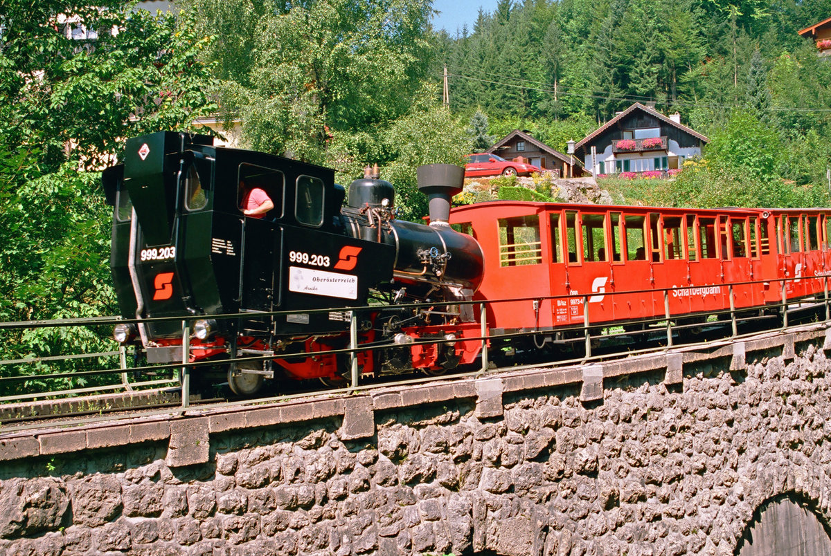 26. August 2000, Österreich, Schafbergbahn, Lok 999 203 auf Bergfahrt. In den Jahren 1992 bis 1996 erhielt die Österreichische Schafbergbahn zum Ersatz der aus den Jahren 1893 und 1894 stammenden Lokomotiven vier von SLM Winterthur gebaute Neubauloks (heute Z11 bis 14).