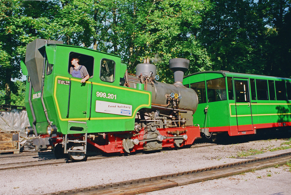 26. August 2000, Österreich, Schafbergbahn, Lok 999 201 mit Zug im Seebahnhof. In den Jahren 1992 bis 1996 erhielt die Österreichische Schafbergbahn zum Ersatz der aus den Jahren 1893 und 1894 stammenden Lokomotiven vier von SLM Winterthur gebaute Neubauloks (heute Z11 bis 14).