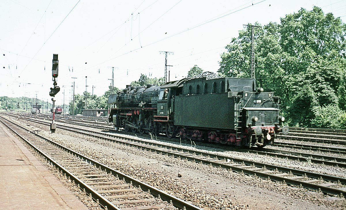Mitten durch Mechernich führt die Eifelbahn, die 215 135-5 an einem Wintertag Ende der 1980er Jahre befährt. Damals konnte ich mich noch über die Hecke recken, um den Zug aufs Bild zu bekommen, am 04.07.2020 wäre schon eine Leiter notwendig gewesen, um den nach Kall fahrenden 620 komplett abzubilden (aber dann wäre es nach meinem Verständnis auch kein korrekter Einst&Jetzt-Vergleich)