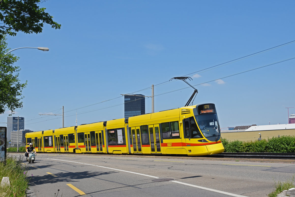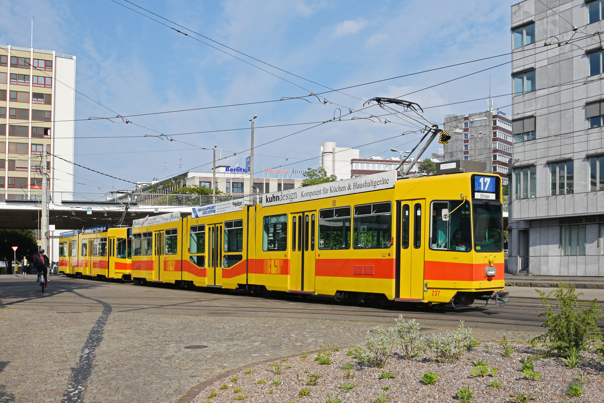 Doppeltraktion, mit dem Be 4/8 237 und dem Be 4/6 203, auf der Linie 17, fährt zur Haltestelle ZOO Basel. Die Aufnahme stammt vom 16.05.2020.