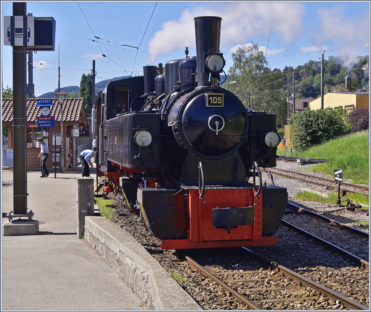 Die Blonay-Chamby G 2x 2/2 105 wartet mit dem letzten Dampfzug des Tages in Blonay auf die Abfahrt nach Chaulin.