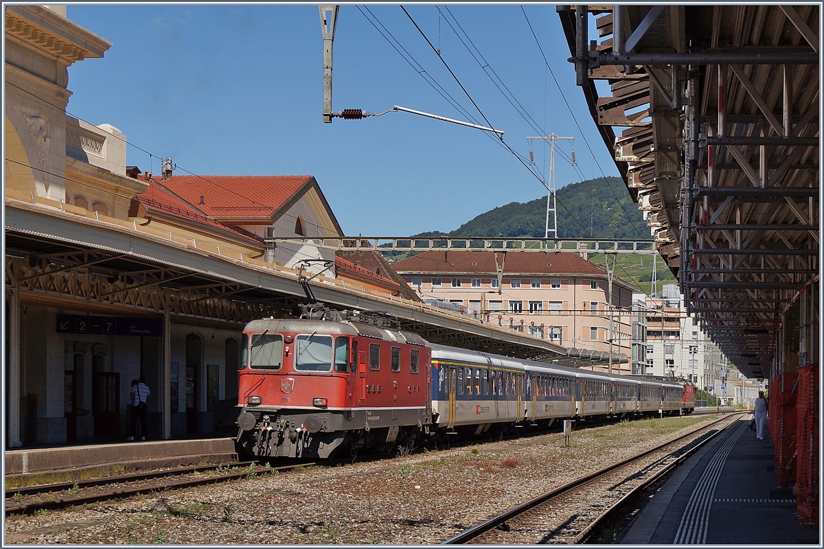 Die SBB Re 4/4 11195 und eine weitere sind mit ihrem Dispozug in einem IR90er Umlauf unterwegs und verlassen Vevey in Richtung Lausanne.