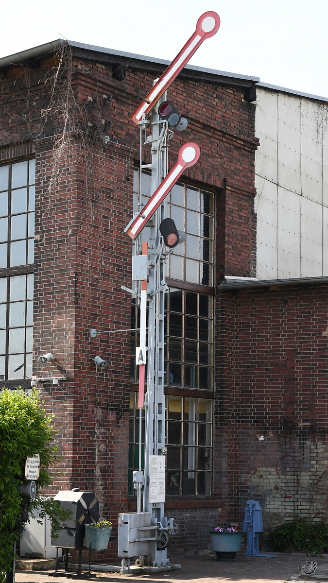 Ein altes Formsignal war Mitte Juni 2020 vor dem Lokschuppen Pomerania in Pasewalk zu sehen.