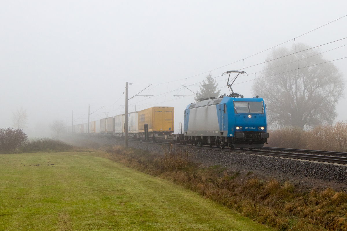 Frühnebel am 10. November 2019 bei Laubenzedel: 185 523-8 ist die Zuglok.