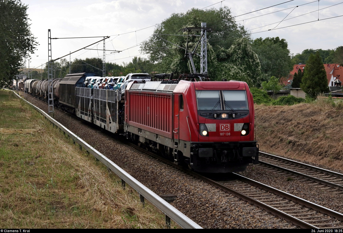Gemischter Gz mit 187 138-3 DB fährt in Zscherben, Angersdorfer Straße, auf der Bahnstrecke Halle–Hann. Münden (KBS 590) Richtung Halle (Saale).