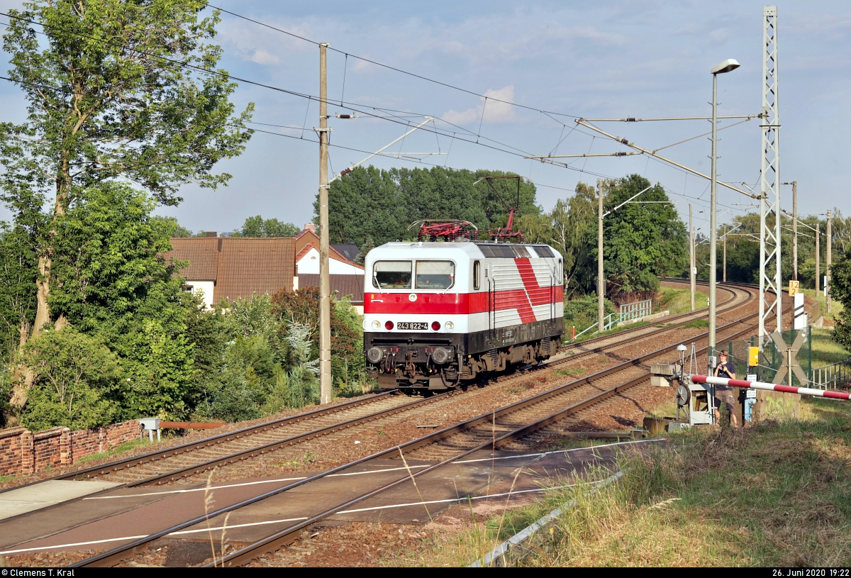 Stattdessen zeigte sich 143 822-5 (243 822-4) der Erfurter Bahnservice GmbH (EBS) unerwartet. Die "Weiße Lady" passiert hier die Anrufschranke in Zscherben, Angersdorfer Straße, auf der Bahnstrecke Halle–Hann. Münden (KBS 590) Richtung Teutschenthal.