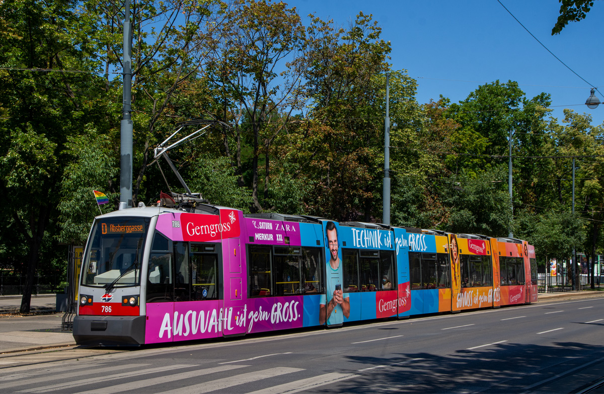 Wiener Linien ULF B1 786 als Linie D, Stadiongasse Parlamen, 05.07.2020