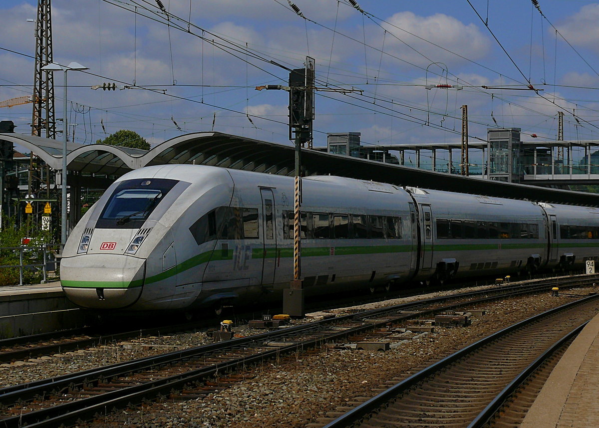 Zu sehen ist 412 024 welcher einen komplett grünen Streifen besitzt, am 22.8.19 im Ulmer Hbf. Kurz darauf setzte er seine Fahrt nach München fort.
