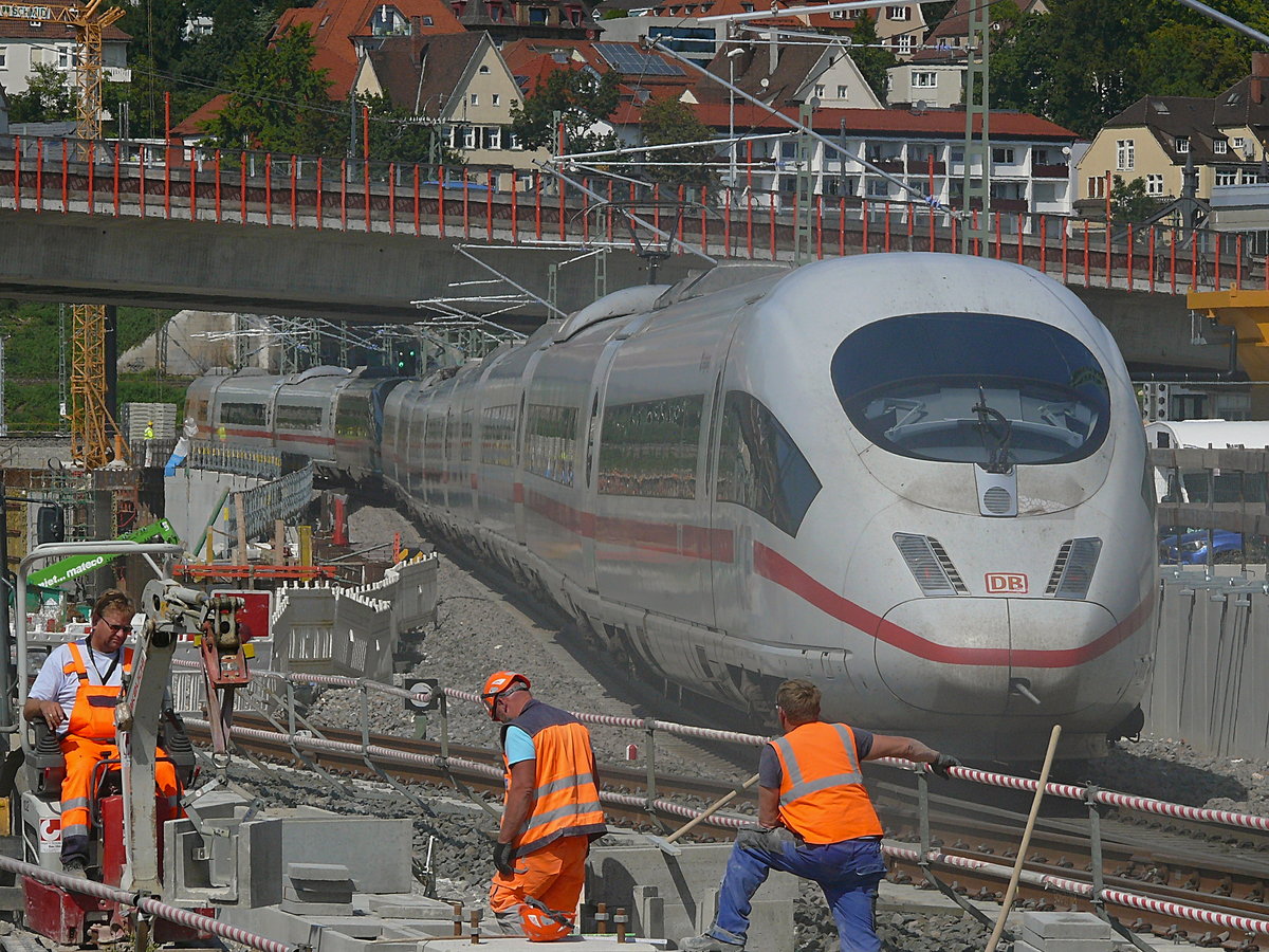 Zu sehen ist ein 403 und weiter vorne 403 514 "Der kleine ICE" welche zusammen am 22.8.19 auf dem Weg nach Dortmund waren. Außerdem sieht man Bauarbeiter welche Gleise für die Zufahrt zur Neubaustrecke Stuttgart-Ulm verlegen.