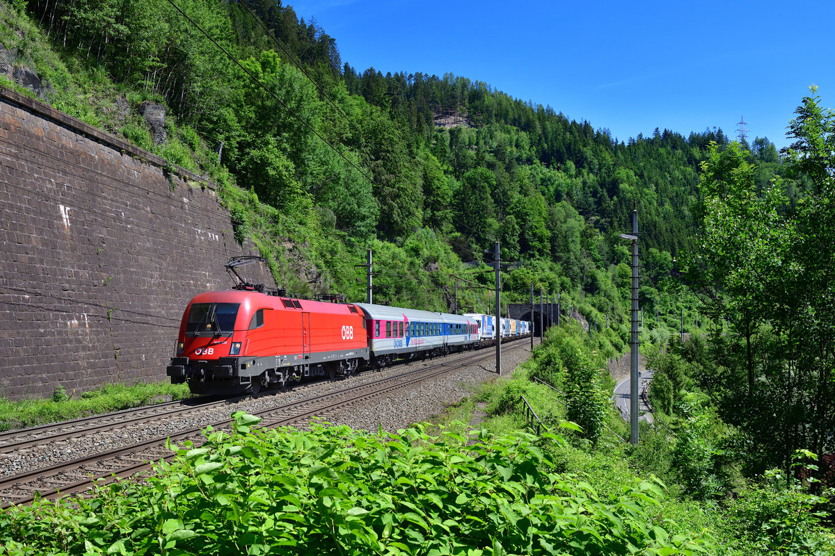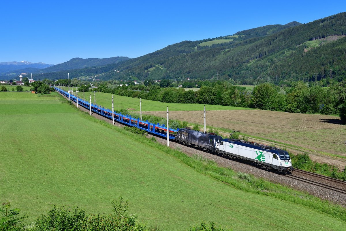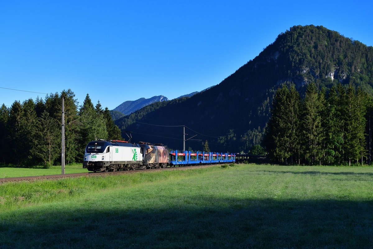 183 717 + 182 510 mit einem Autoleerzug am 12.06.2020 bei Roßleithen.