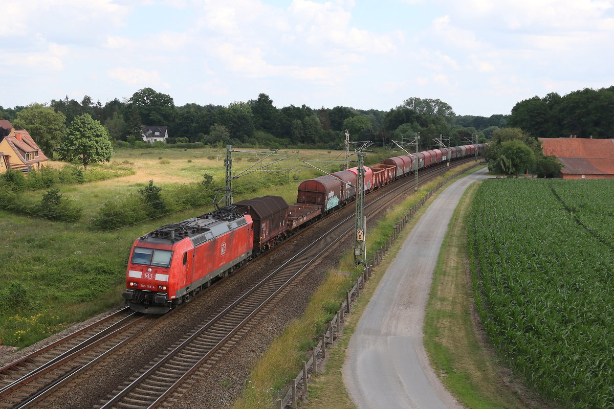 185 148 mit einem gemischten Güterzug am 25. Juni 2020 bei Langwedel/Niedersachsen.