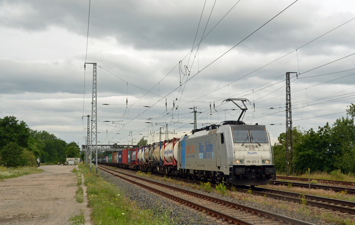 186 423 der RTB führte am 01.07.20 einen Containerzug durch Saarmund Richtung Schönefeld.