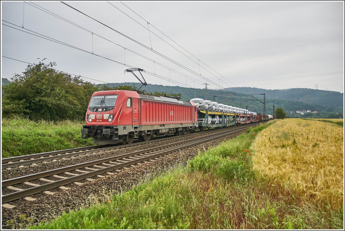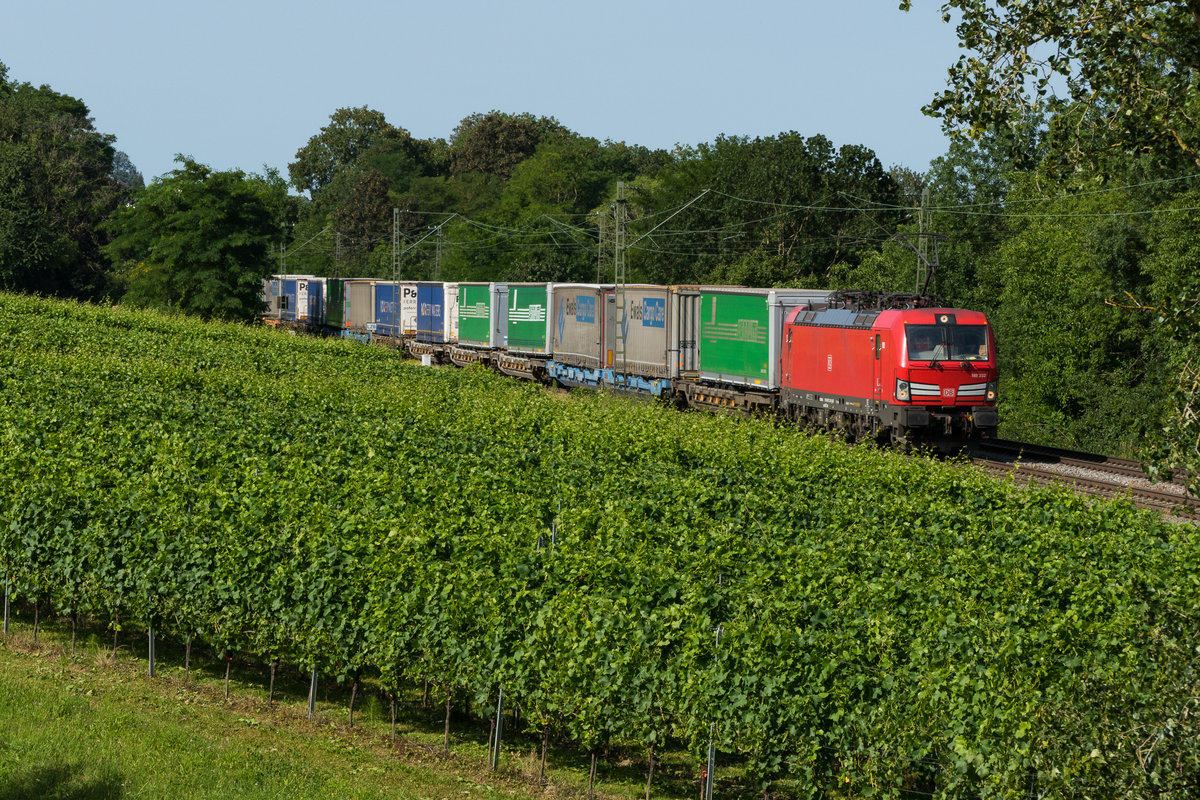 193 332 fährt mit den Sattelauflieger Zug im Weinberg bei Bad Bellingen auf der Rheintalbahn Richtung Norden. 10.07.2020