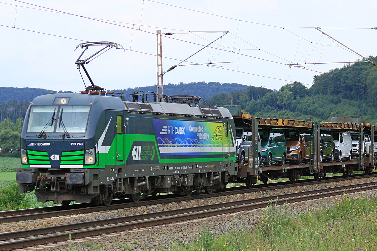 Mit einem Kesselwagenzug von Neuburg an der Donau nach Hannover Linden konnte ich am 01. Juni 2020 die neue Werbelok der ÖBB Tochter RCC bei Esslingen im Altmühltal fotografieren. Die von MRCE angemietete 189 286 erinnert mit ihrer gefälligen äußeren Gestaltung an die 1014.011. Diese warb schon vor über 25 Jahren mit einer ähnlichen Farbaufteilung für Rail Cargo Austria.