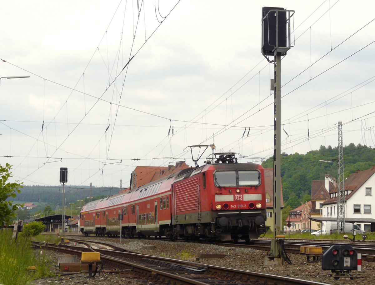 20. Mai 2008, Lok 143 319 verlässt mit einer Dosto-Garnitur als RB 16855 Naumburg - Lichtenfels den Bahnhof Kronach.
