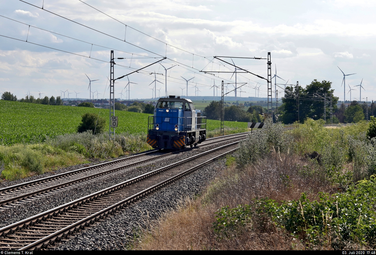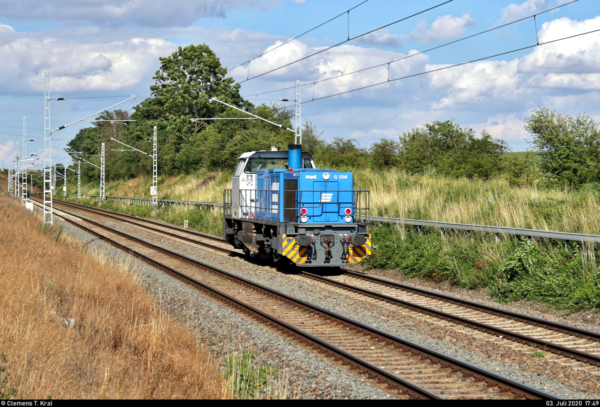 275 842-3 (D 05 | MaK G 1206) der Regental Cargo (Regentalbahn AG | Die Länderbahn GmbH (DLB)) als Tfzf fährt bei Eisdorf (Teutschenthal) auf der Bahnstrecke Halle–Hann. Münden (KBS 590) Richtung Halle (Saale).