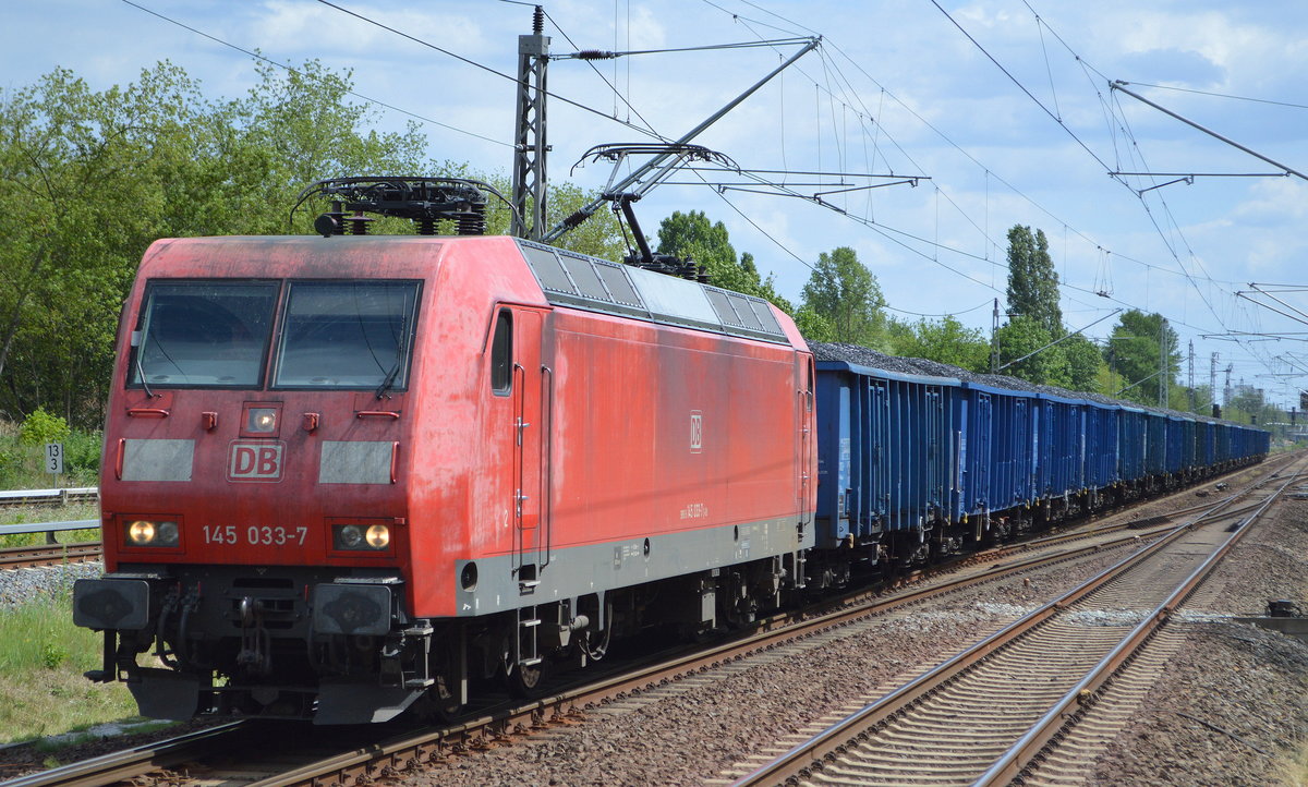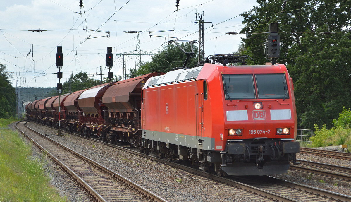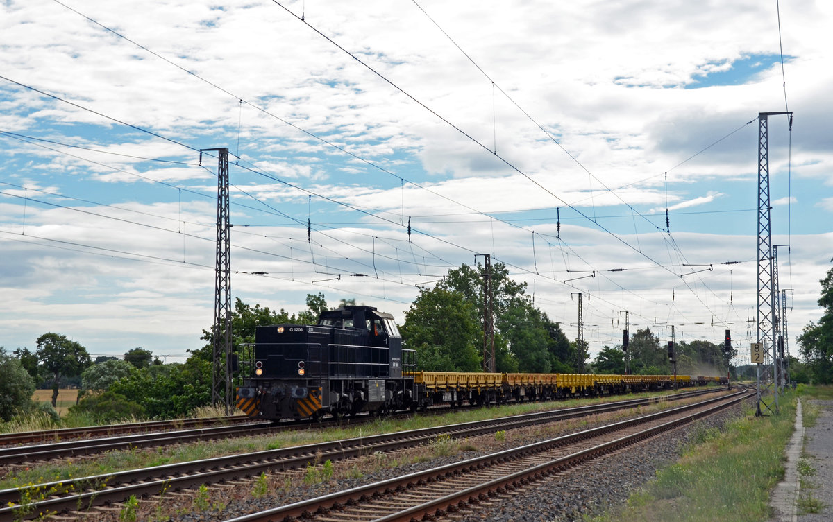 Am 01.07.20 führte 185 396 einen mit Stahlplatten beladenen Rungenwagenzug durch Saarmund Richtung Potsdam.