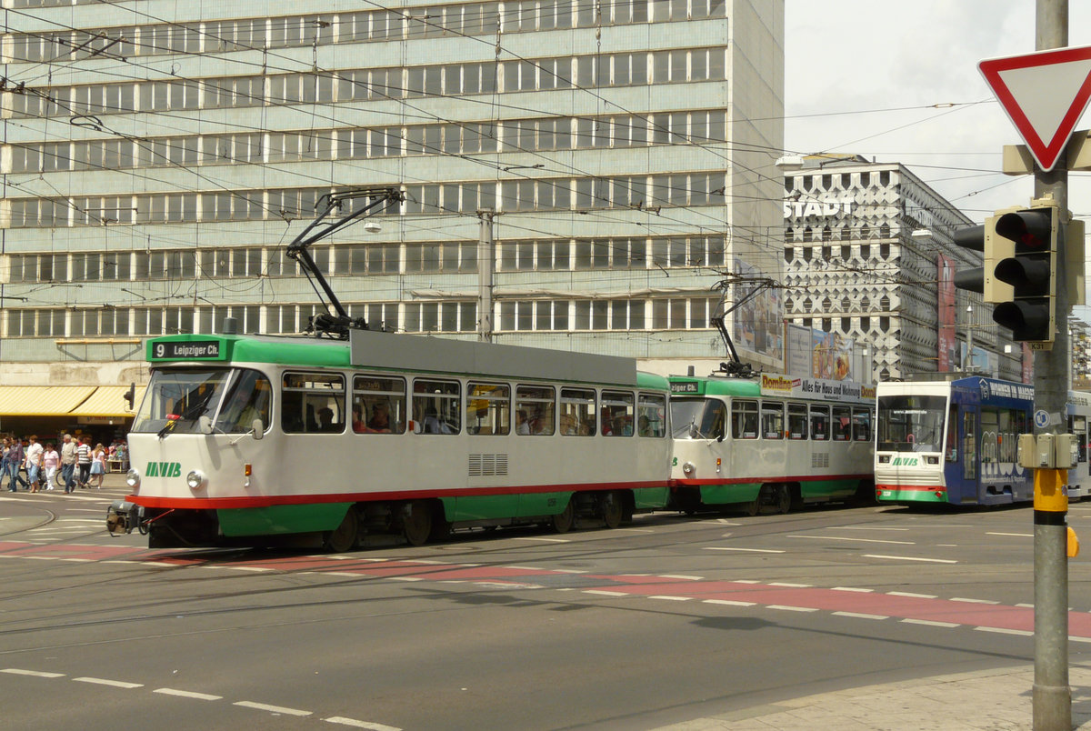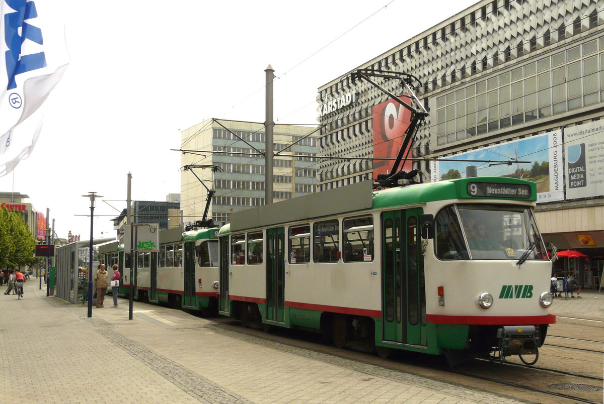 Am 20. Juni 2008 in Magdeburg. in der Fritz-Reuter-Allee hält ein Tatra-3er Zug, geführt von Triebwagen 1268.