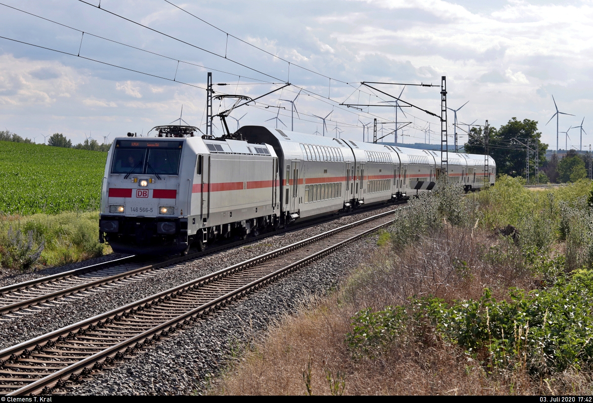 Sehr pünktlich fährt hier 146 566-5 DB als IC 1959 von Düsseldorf Hbf nach Leipzig Hbf bei Eisdorf (Teutschenthal) auf der Bahnstrecke Halle–Hann. Münden (KBS 590).