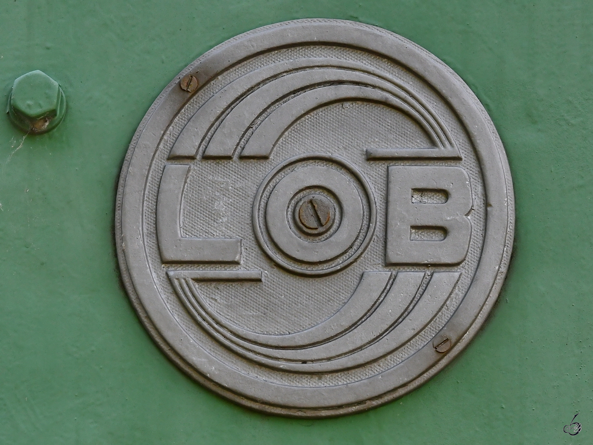 Blechschild mit Logo an der Dampfspeicherlokomotive 146732 vom Typ FLC, welche in der Nähe des Lokschuppens Pomerania in Pasewalk ausgestellt ist. (Juni 2020)