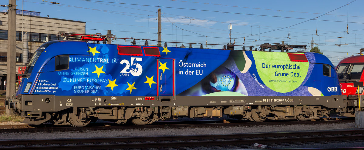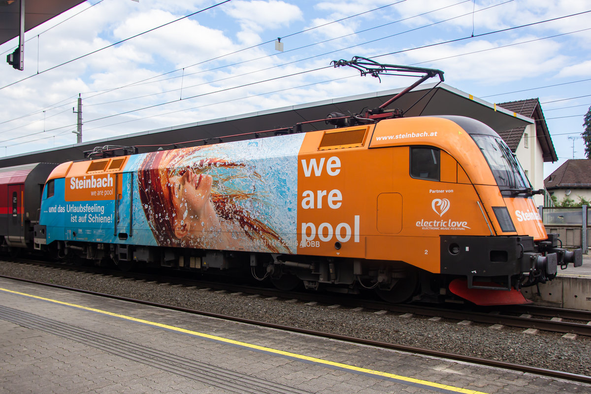 Der mittlerweile etwas ältere Neuzugang an Werbelok bei der ÖBB "Steinach we are Pool" am 21.6.20 in Dornbirn. 1116 229-6