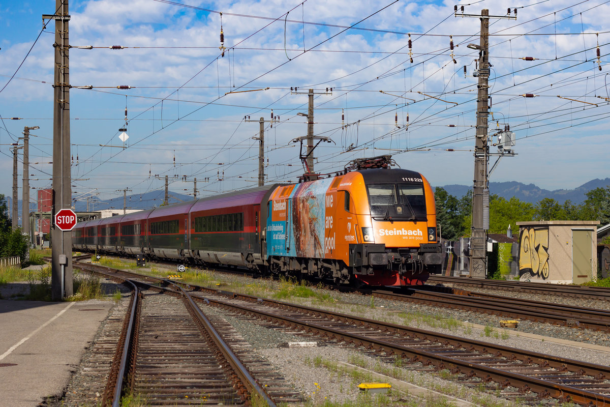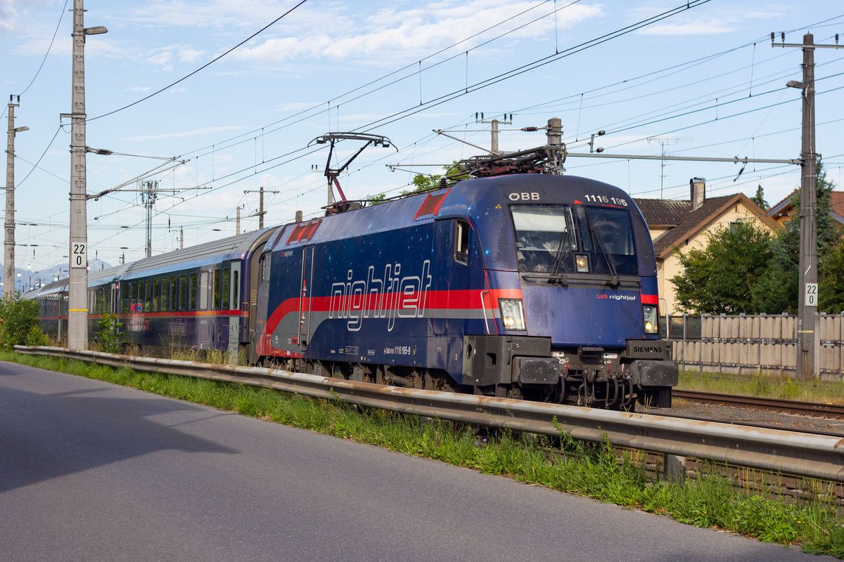 Die Nightjet Lok 1116 195-9 Stilecht vor einem Nightjet. Bei der Ausfahrt in Dornbirn. 1.7.20