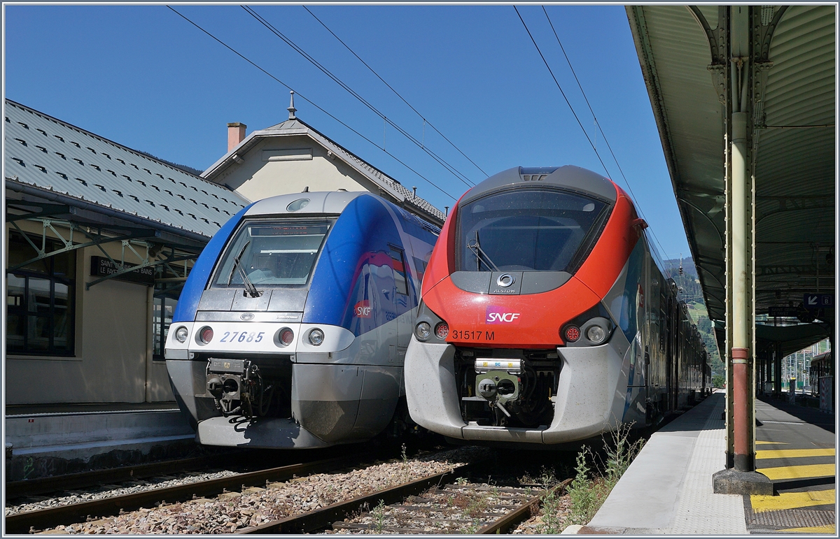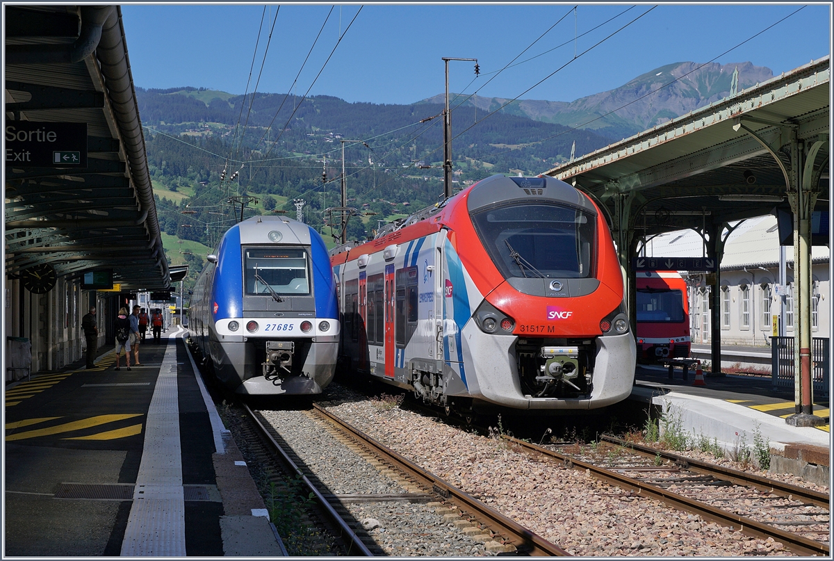 In St-Gervais Les Bains Le Fayet wartet der SNCF Z 27685 als TER 884662 auf die baldige Abfahrt nach Annemasse, während der SNCF Coradia Polyvalent régional tricourant Z 31517 M eine Stunde später als Léman Express L3 23482 nach Coppet fahren wird.